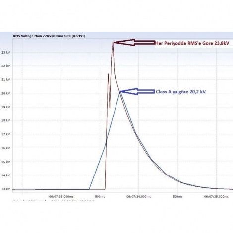 - Akım ve gerilim kayıtlarını yaparken, her bir kayıt frekansı içinde 10 msn de bir RMS değer hesaplayarak, min/max değerlerin algılanması ve otomatik olarak kaydı ve bu min/max değerlerin değişim eğrilerinin çizimi